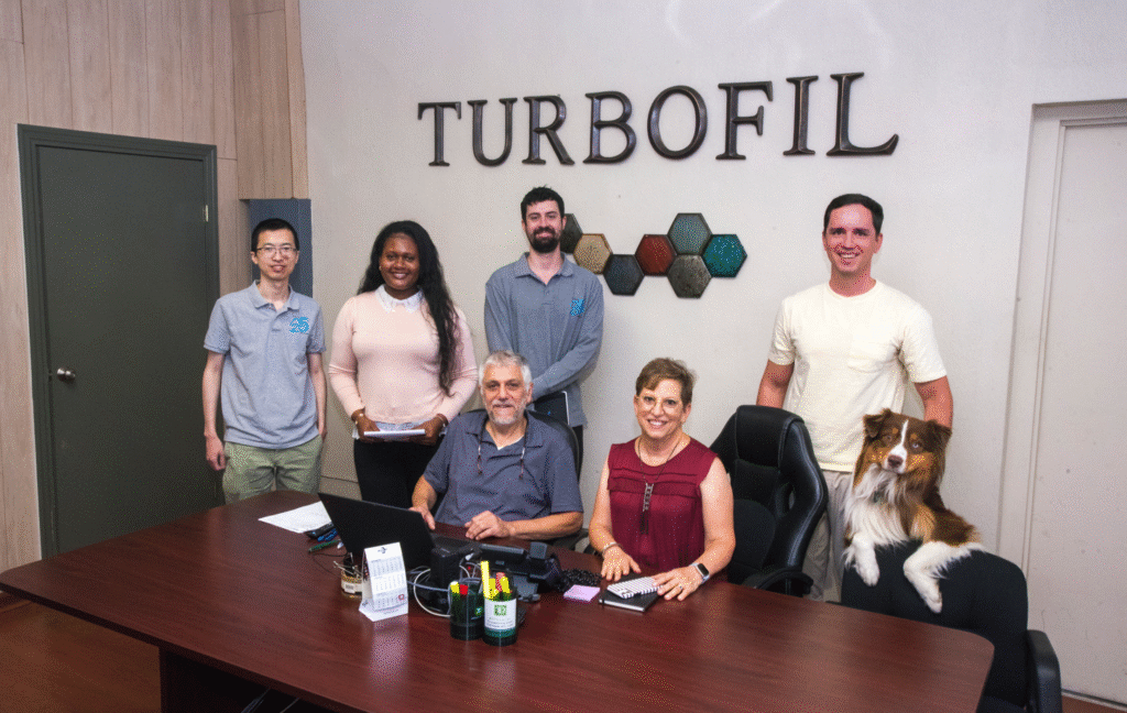 TurboFil principles Eli Uriel (seated, left) and Deborah Smook (seated, right) meet with team members at the company’s Mount Vernon headquarters, accompanied by the official TurboFIl Team Mascot, Teddy.